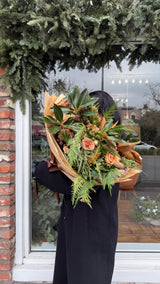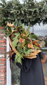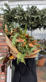 Celebrate the season with our Earthy Holiday Bouquet. Lush greens and rich browns intertwine, creating a stunningly understated display. Let nature's beauty bring warmth and joy to your home this holiday season.